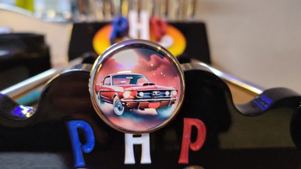 Matières de nos Lance-billes : Bouton Inox massif ou Laiton massif, poli miroir – Image sous verre effet métallisé selon couleurs.