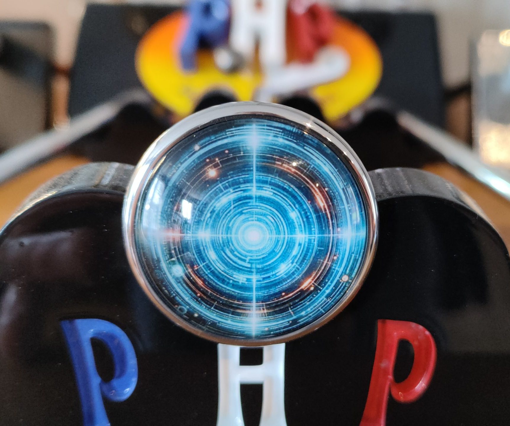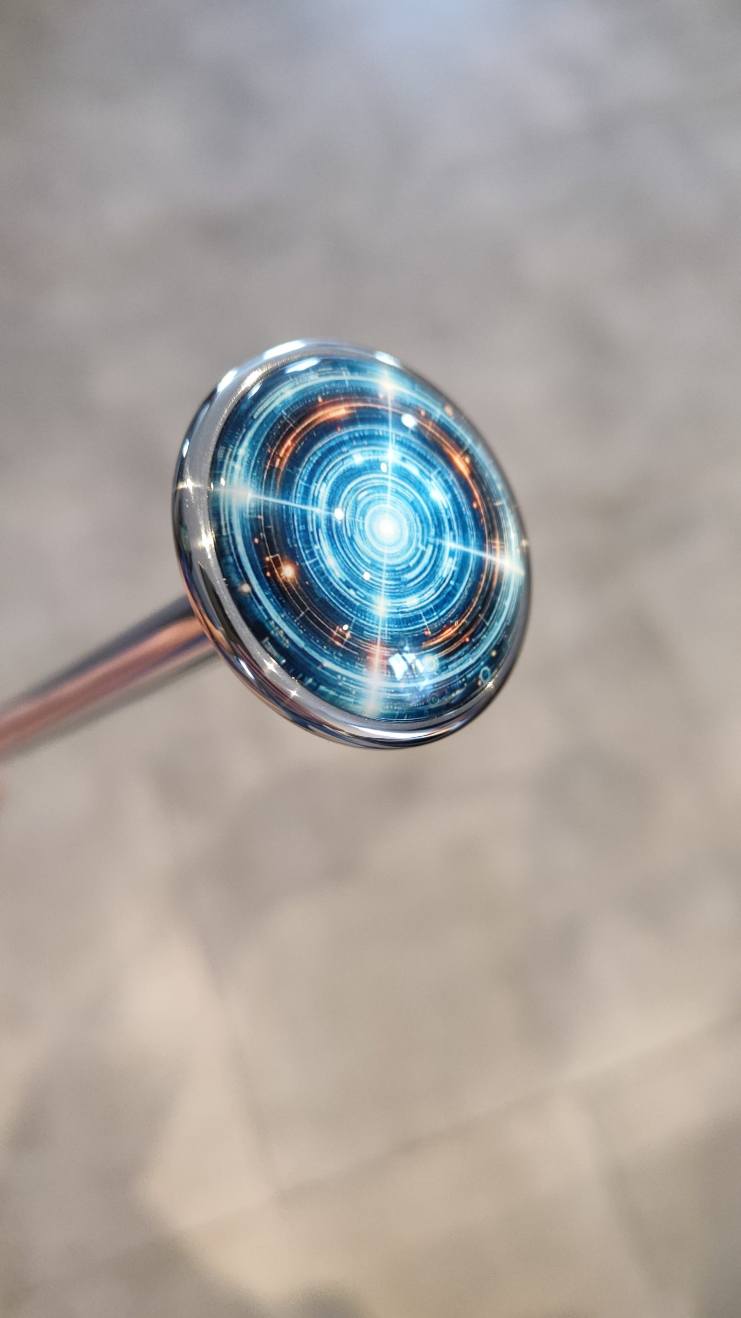 Matières de nos Lance-billes : Bouton Inox massif ou Laiton massif, poli miroir – Image sous verre effet métallisé selon couleurs.
